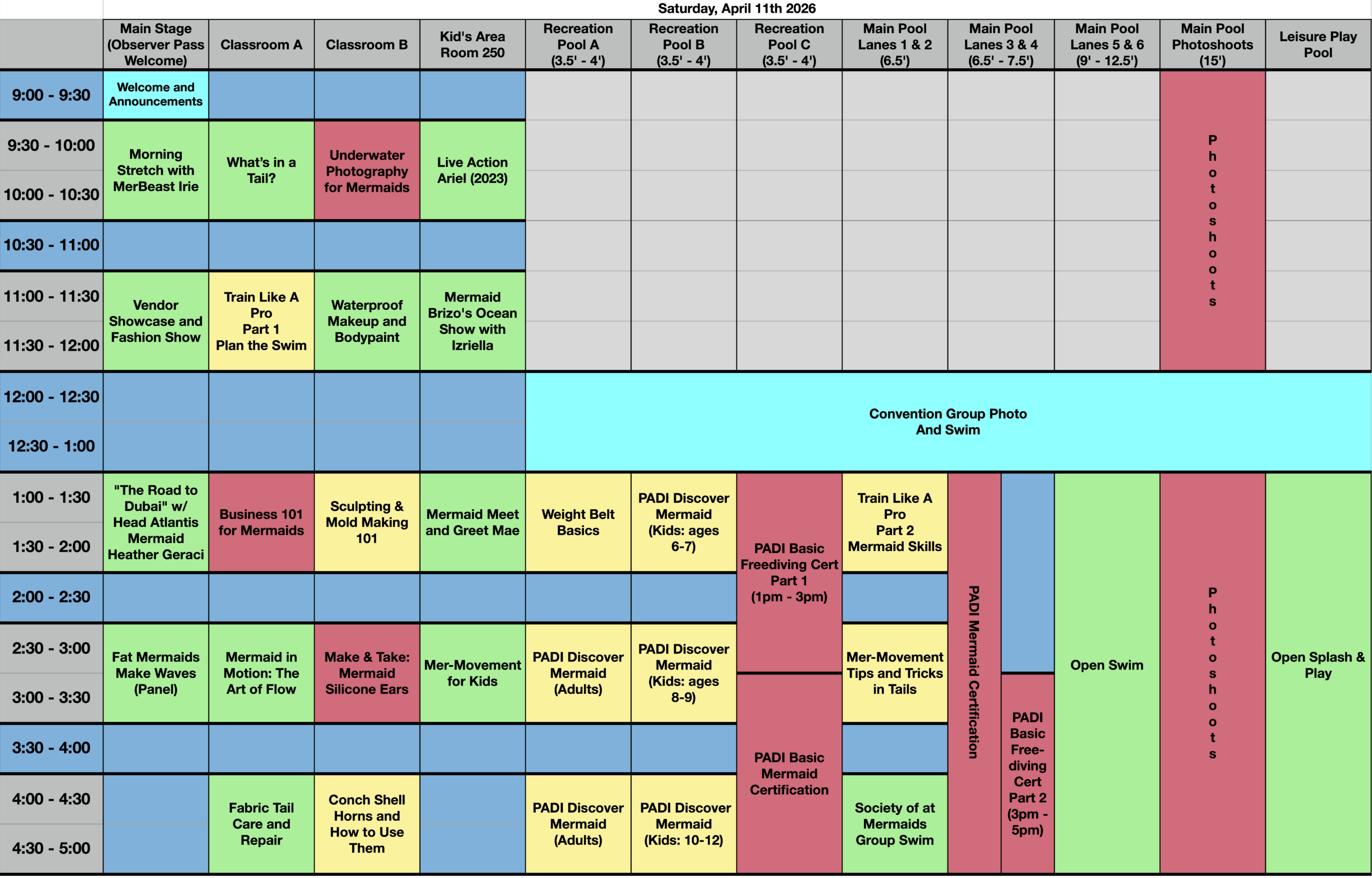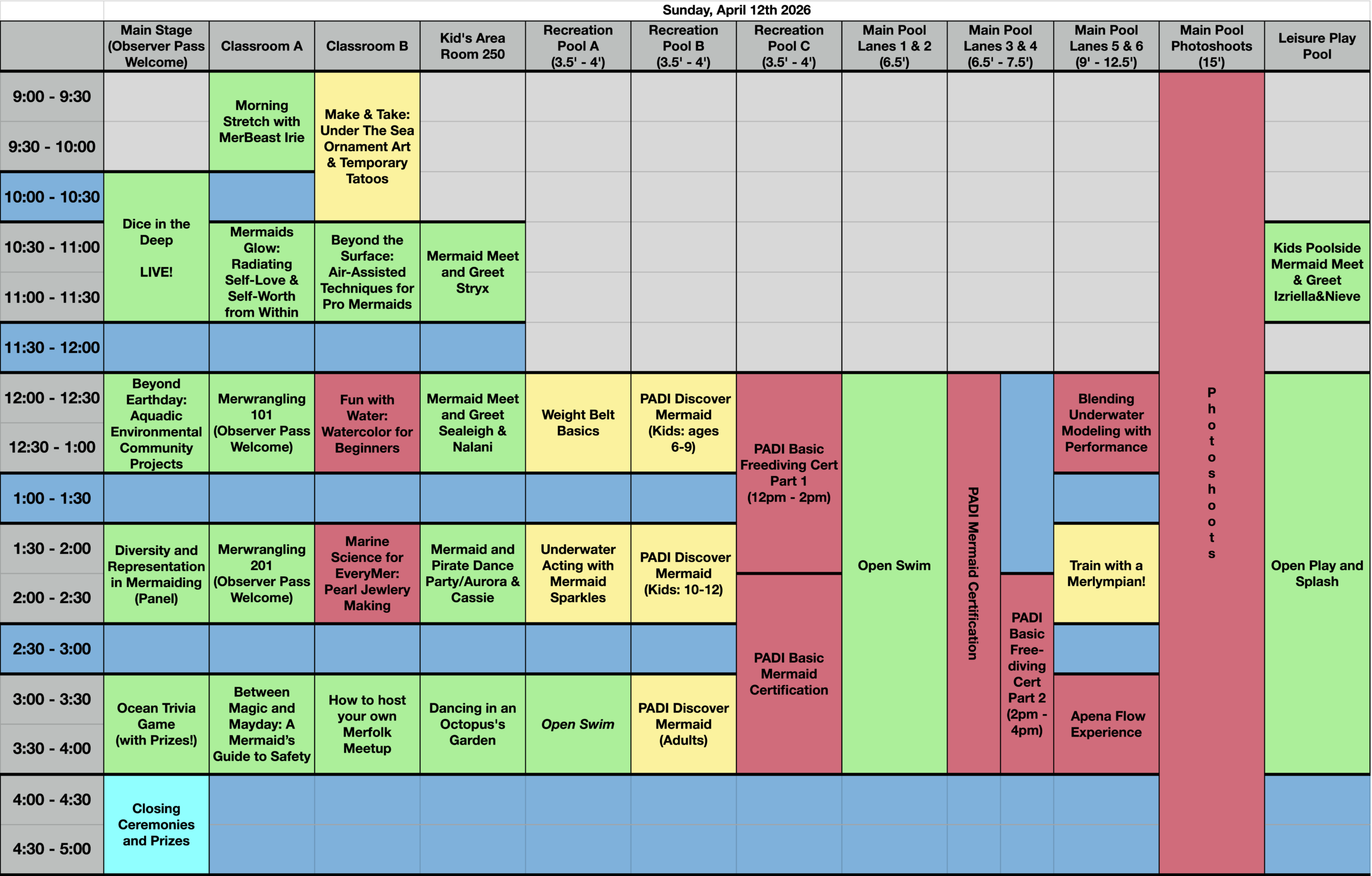 Red: Specialty Programming. In order to attend these specialty options you must have a Participant or Merling Pass as well as purchase the course of your choosing here. Photography Sessions can be booked directly with the photographer. Explore Photography packages here. Certification courses are booked directly by the instructor (see the course catalog for more details)